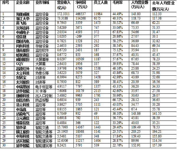 5、這30家企業只有一家虧損企業,毛利率較低的企業人均營業額都比較高,例如10家安防工程類企業人均營業額超過100萬元的有5家。而以產品為主的公司20家中只有海康、大華兩家的的人均營業額超過100萬元。