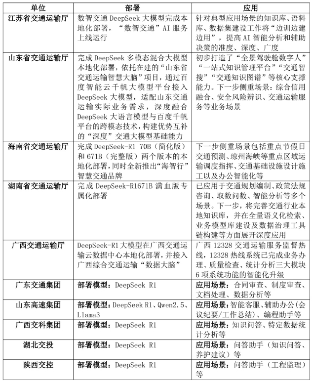 DeepSeek在交通運輸領域部署與應用的部分情況