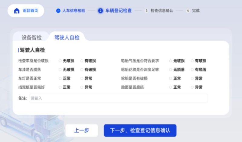 車輛檢查登記智能檢查:車輛進站后,由駕駛人自主在自助檢查終端進行車輛檢查登記,登記完成后,如車輛未有智能設備識別的異常,則提示駕駛人安全駛離。