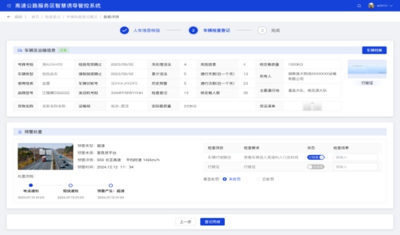“高速公路服務區智慧誘導管控系統”以分類分級管控理念為核心,借助信息化技術手段對重點車輛進行智慧誘導進站檢查,對客危車輛的檢查登記和預警車輛的核查過程形成標準化、規范化的信息管理,有效提高民警勤務效能;利用智能AI服務、智能設備實現車輛檢查登記過程中材料自動取證、安全隱患智能分析,對車輛檢查登記信息進行大數據綜合分析,對客危車輛安全風險隱患進行預警提示,有效防范安全隱患。通過科技賦能,科學分級管控實現成果增效。