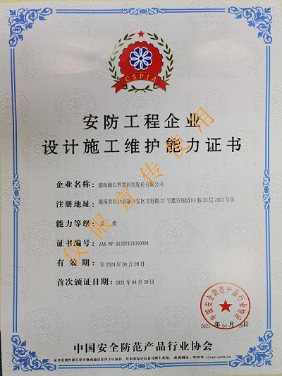 依照《安防工程企業(yè)設(shè)計施工維護能力評價管理辦法》、《安防工程企業(yè)設(shè)計施工維護能力評價標準》,經(jīng)由中華人民共和國公安部認可的中國安全防范產(chǎn)品行業(yè)協(xié)會層層審核后,湘江智慧在擁有湖南省安全技術(shù)防范協(xié)會認定的《安全技術(shù)防范壹級》資質(zhì)的基礎(chǔ)上,于2021年4月29日,正式被中國安全防范產(chǎn)品行業(yè)協(xié)會認定并授予《安防工程企業(yè)設(shè)計施工維護能力壹級》資質(zhì)證書。至今為止,湘江智慧成為湖南省獲得《安防工程企業(yè)設(shè)計施工維護能力壹級》資質(zhì)的第四家單位。