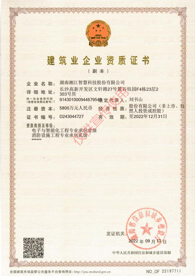近日,經(jīng)湖南省住房和城鄉(xiāng)建設(shè)廳批準(zhǔn),湘江智慧成功取得消防設(shè)施工程專業(yè)承包貳級(jí)資質(zhì),為公司總承包事業(yè)發(fā)展再添基石。