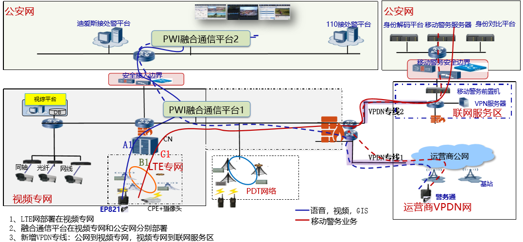 目前公安多張網絡共存,PDT專網(351~356MHz;361~366MHz)用于集群語音通信,340M(336~344MHz)圖傳網用于傳輸無線圖象,移動警務基于運營商網絡,1.4G(1430~1438MHz)用于航空器圖傳網絡。實際上可對公安這些頻段進行優化,采用PDT+LTE寬窄一體化系統實現全國一張通信網來完成語音集群、圖象傳輸和移動警務等功能。