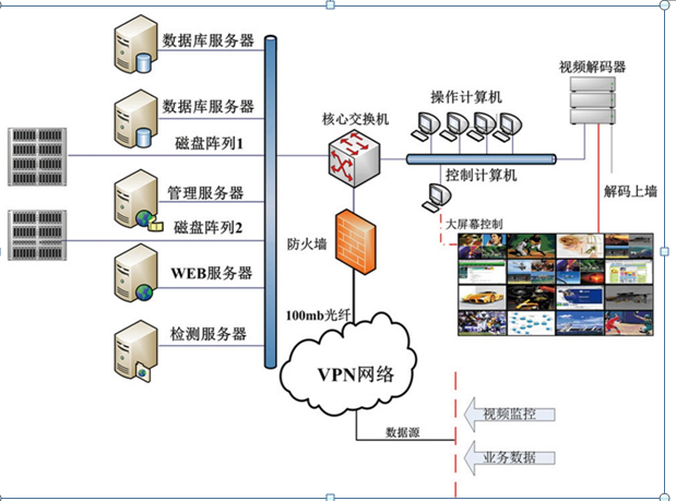 在省、市、縣等治超機構建設管理指揮中心,對所轄區域內的治超數據進行監管 、執法、指揮調度。數據中心包括防火墻、核心交換機、光存儲交換機等網絡設備,配置服務器及磁盤存儲陣列,用于治超信息實時存儲,并保證數據安全。通過VPN治超專網,各級指揮中心統一從數據中心獲取本轄區的治超數據并進行監管;遠程連接現場的音視頻設備,在拼接屏上顯示現場實時圖像,并實現各級治超機構之間的實時語音通訊;各級治超機構之間通過部署《治超信息綜合管理系統平臺》實現治超執法、指揮調度、數據抄告、協同辦公。