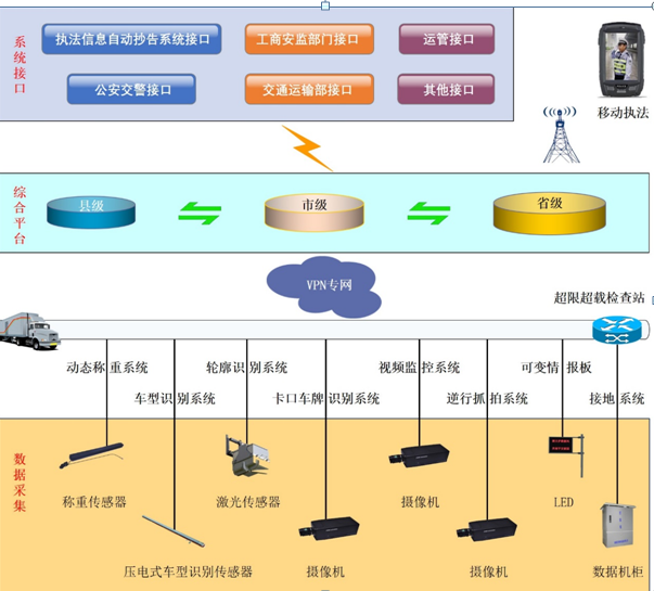 優勢:(1)系統涵蓋所有環節,包含高速預檢、站內精檢、執法操作、流動稽查、音視頻監控、對講等;(2)我司與國內大多數稱重設備、監控設備等廠家建立了良好的合作關系,已開發完成大多數硬件設備數據采集接口,可針對客戶的不同需求,進行快速開發部署。