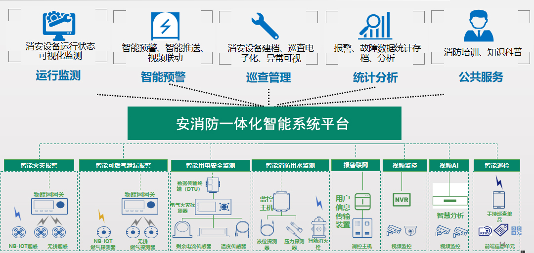 安消防一體化智能系統平臺對視頻監控、消防管理、出入口控制、信息化巡檢、用戶管理、關聯控制、數據存儲、遠程管理等功能模塊實現無縫整合和管理,能夠實現大樓新建子系統之間的聯動,包括可視化的視頻報警聯動、視頻消防聯動、出入口人員身份中心查詢和復核、車輛出入口抓拍實現中心數據存儲與調閱、前端智能分析主動上傳異常信息并聯動中心視頻遠程管控等,從而將大樓各個部位的安保工作進行緊密結合。